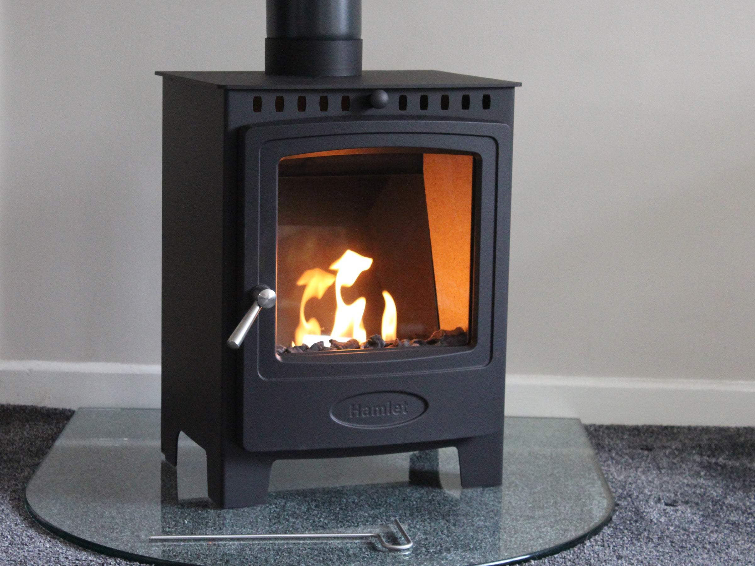 The fuel is burnt in a reservoir to produce an attractive flame and around 2.5kW of heat for Arada stoves. The heat can be varied by moving a slider that shrinks the flame opening.